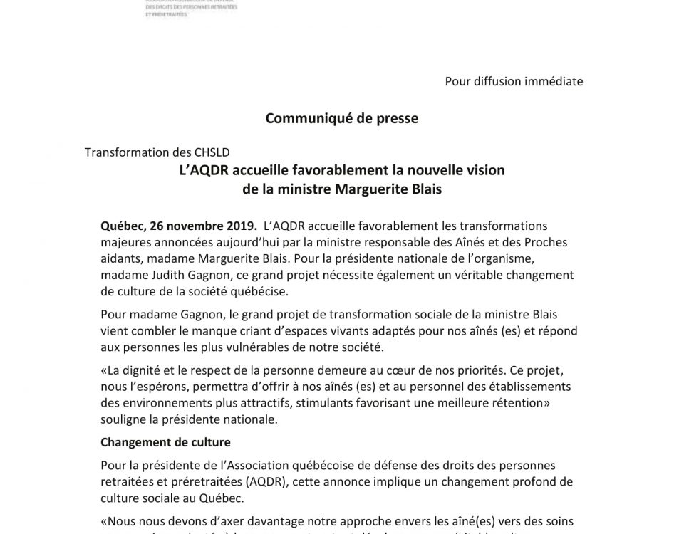 26 novembre 2019 – L’AQDR accueille favorablement la nouvelle vision de la ministre Marguerite Blais