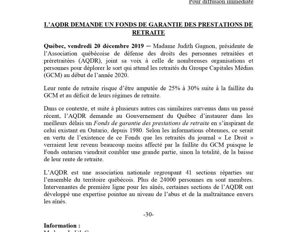 20 décembre 2019 – L’AQDR demande un fonds de garantie des prestations de retraite