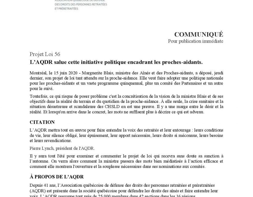15 juin 2020 – Projet Loi 56 | L’AQDR salue cette initiative politique encadrant les proches-aidants.