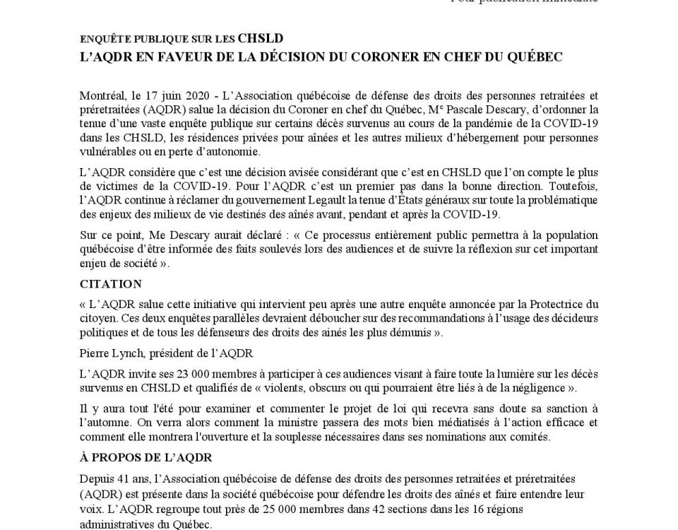 17 juin 2020 – Enquête publique sur les CHSLD : L’AQDR en faveur de la décision du coroner en chef du Québec