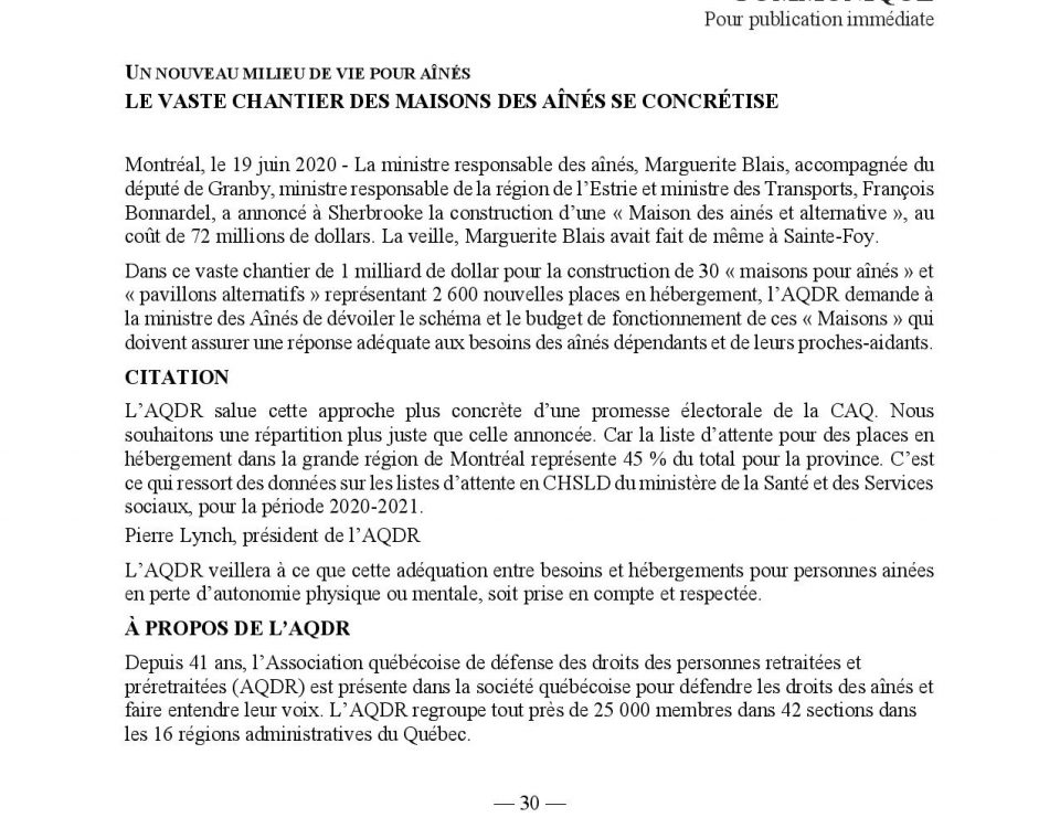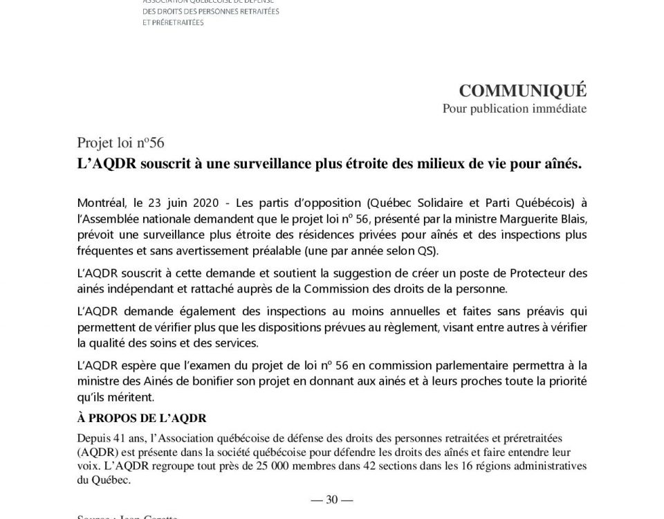 23 juin 2020 – Projet loi no56 | L’AQDR souscrit à une surveillance plus étroite des milieux de vie pour aînés.