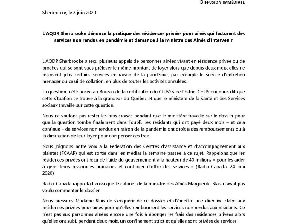 8 juin 2020 – L’AQDR Sherbrooke dénonce la pratique des résidences privées pour aînés qui facturent des services non rendus en pandémie et demande à la ministre des Aînés d’intervenir.