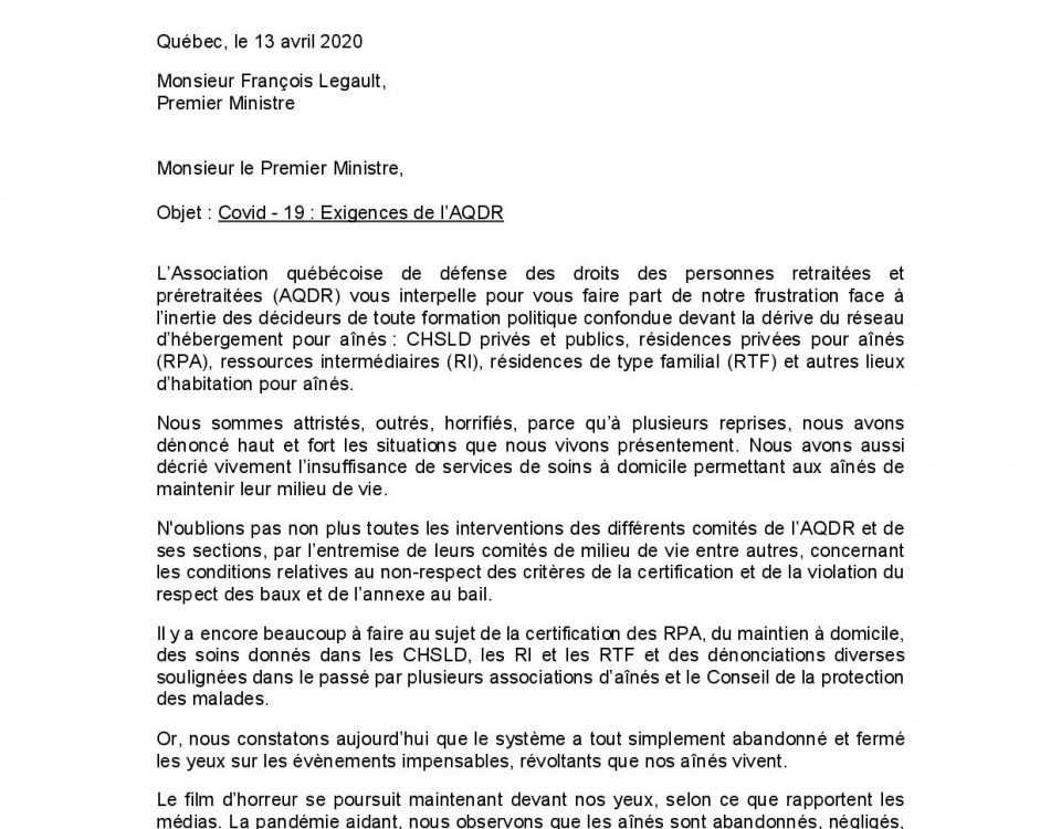Lettre au premier ministre | Covid-19 : Exigences de l’AQDR