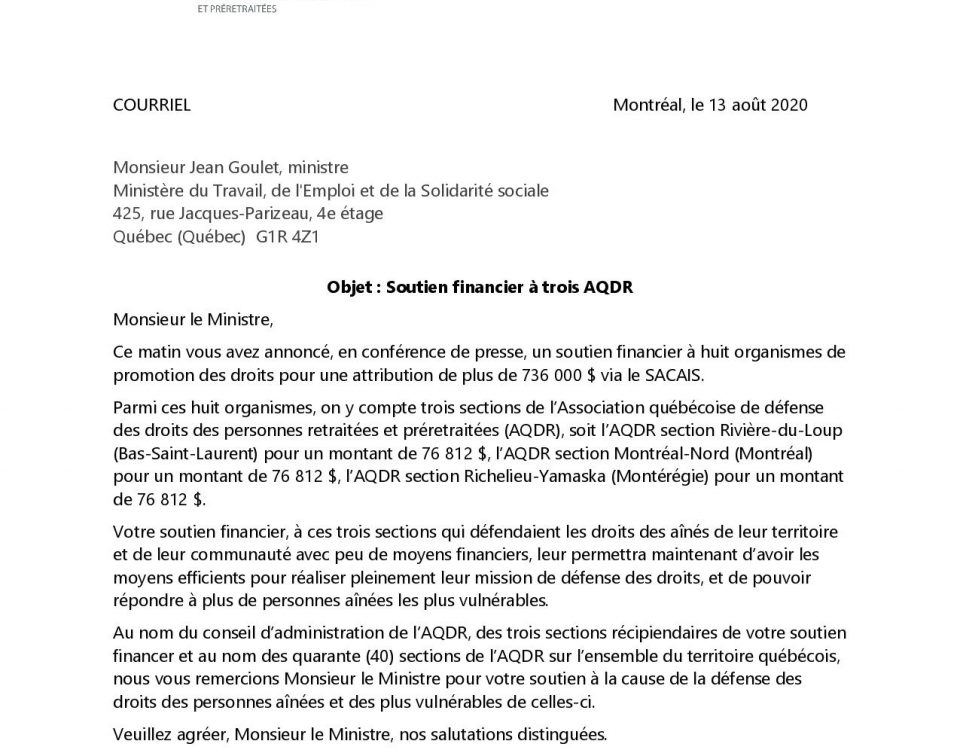 Lettre d’appréciation adressée au ministre Jean Goulet | Soutien financier à trois AQDR