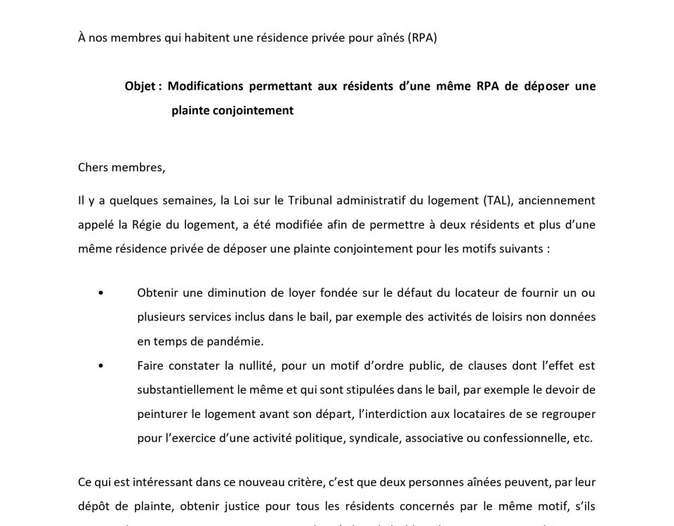 Modifications permettant aux résidents d’une même résidence privée aux aînés (RPA) de déposer une plainte conjointement La loi sur le Tribunal administratif du logement (TAL) a