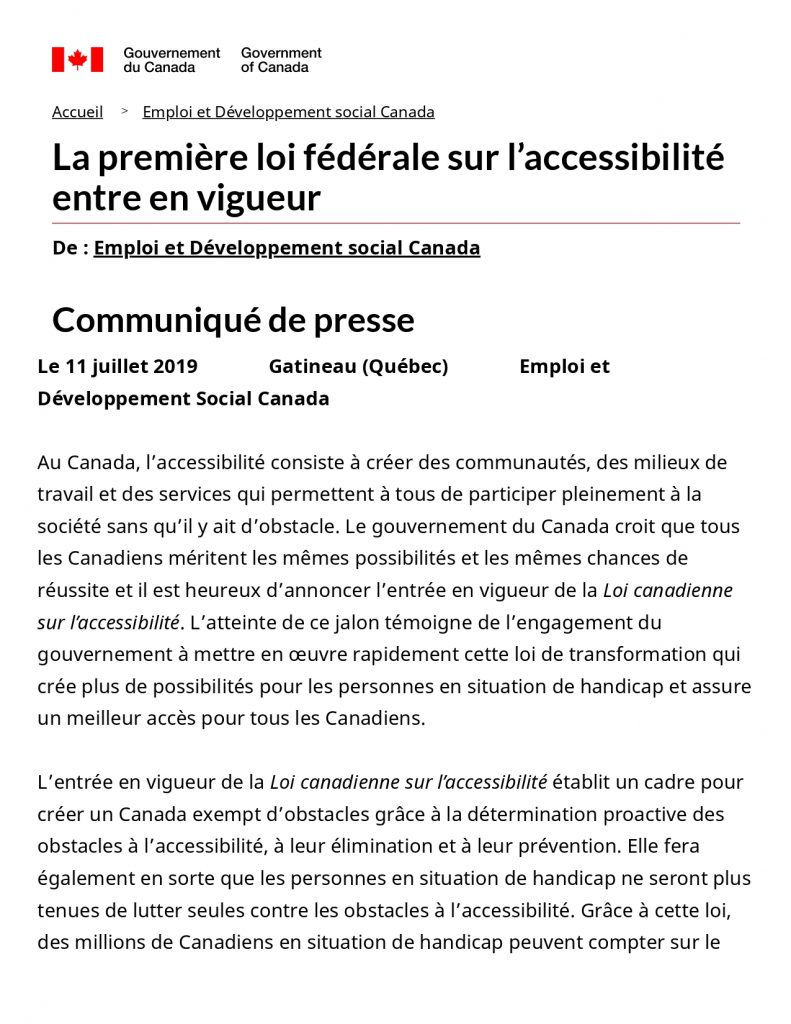 Communiqué de presse Le 11 juillet 2019 Gatineau (Québec) Emploi et Développement Social Canada La Loi canadienne sur l’accessibilité a franchi une autre étape importante. Ce jour marque […]