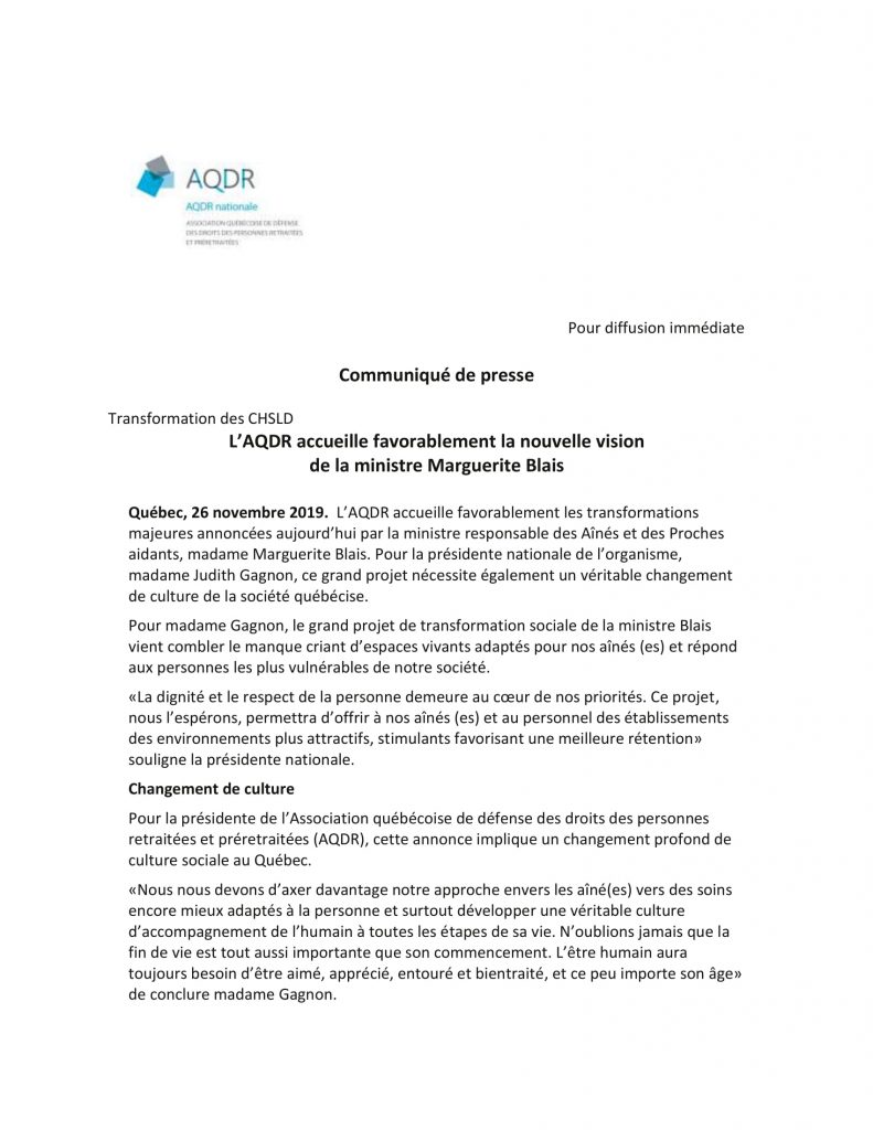 26 novembre 2019 – L’AQDR accueille favorablement la nouvelle vision de la ministre Marguerite Blais