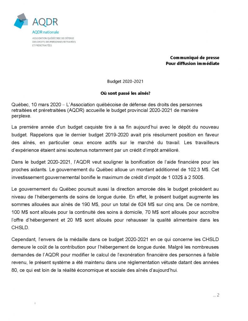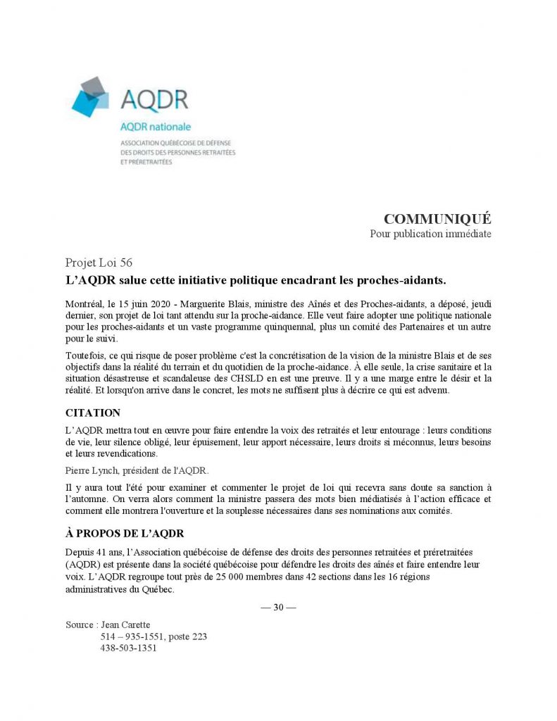 15 juin 2020 – Projet Loi 56 | L’AQDR salue cette initiative politique encadrant les proches-aidants.
