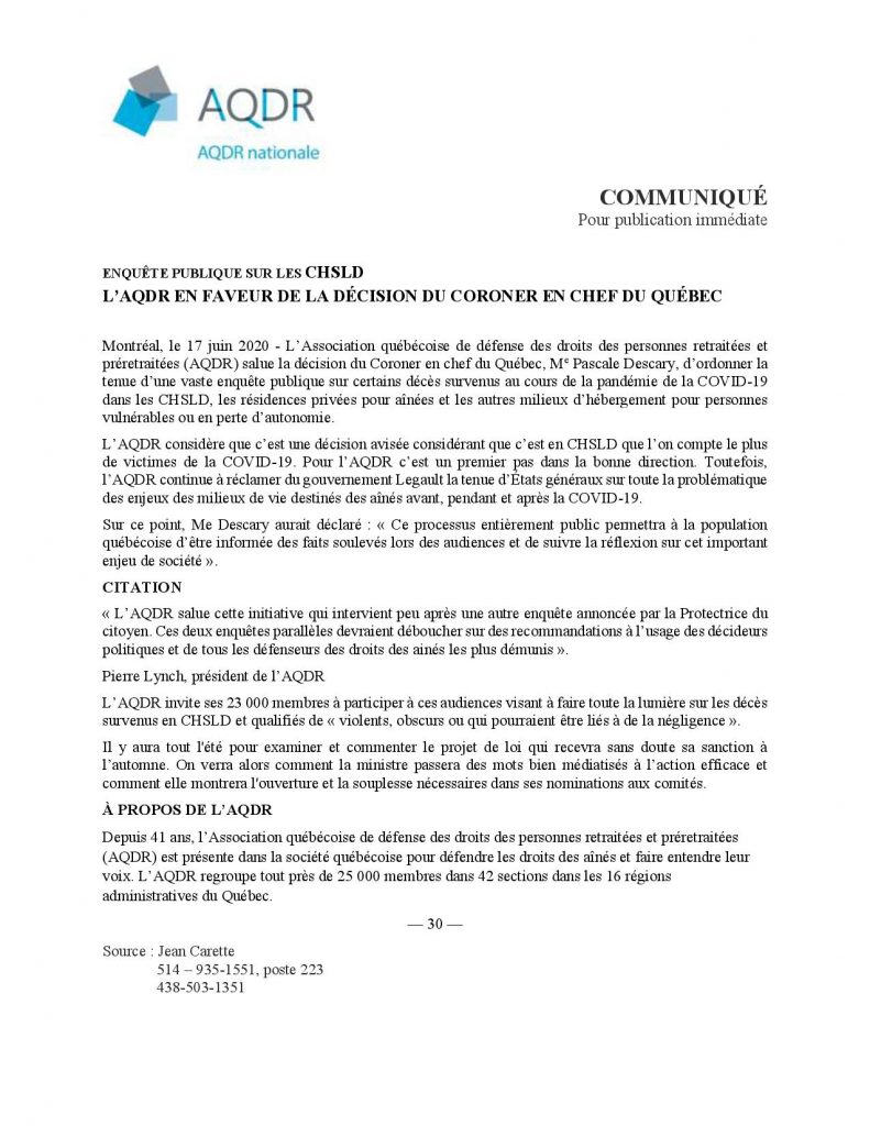 17 juin 2020 – Enquête publique sur les CHSLD : L’AQDR en faveur de la décision du coroner en chef du Québec