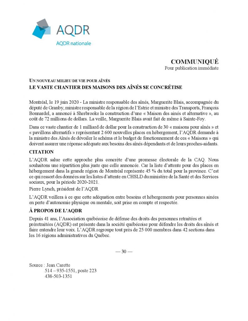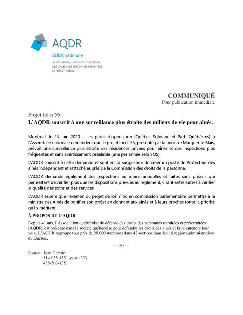 23 juin 2020 – Projet loi no56 | L’AQDR souscrit à une surveillance plus étroite des milieux de vie pour aînés.
