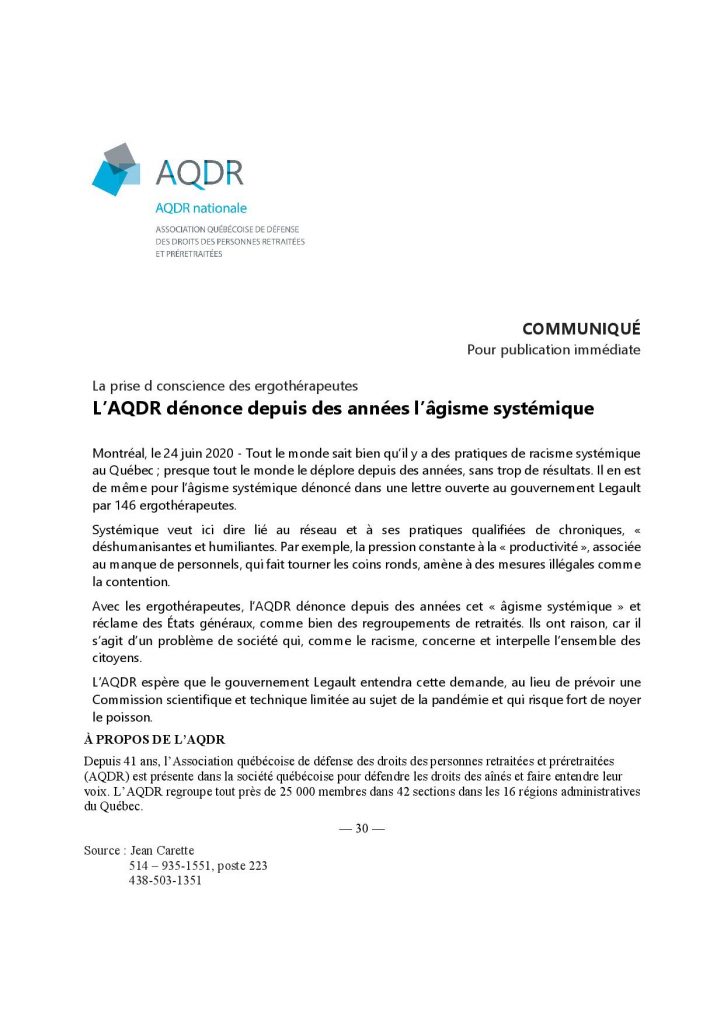 24 juin 2020 – La prise de conscience des ergothérapeutes | L’AQDR dénonce depuis des années l’âgisme systémique.