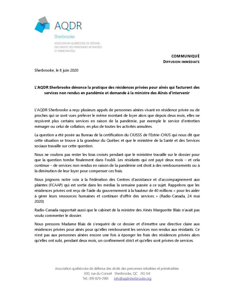 8 juin 2020 – L’AQDR Sherbrooke dénonce la pratique des résidences privées pour aînés qui facturent des services non rendus en pandémie et demande à la ministre des Aînés d’intervenir.